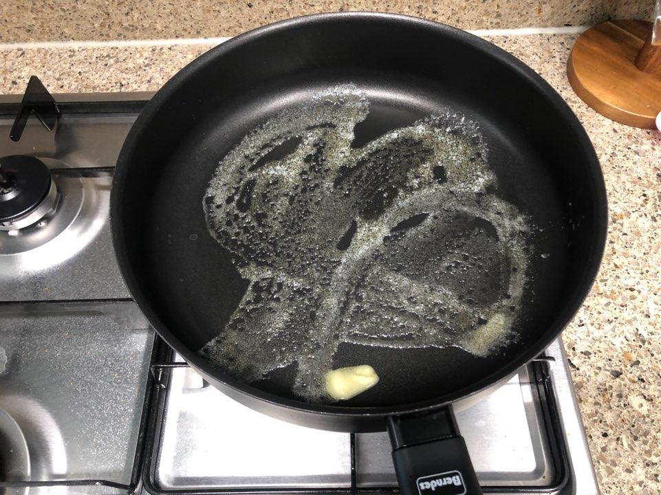 먼저 프라이팬 위에 버터를 칠해줍니다. 이때 버터는 팬 크기에 따라 적당히 조절해주세요. 베이컨의 경우 기름이 어느정도 있기 때문에 버터의 양을 줄이시면 됩니다. 새우의 경우는 버터가 조금 더 많이 들어간다고 생각해주시면 됩니다. 이때 새우나 베이컨이 살짝 익었을 때, 캐첩을 밥 숫갈로 2스푼 정도 넣어줍니다. 2~3인분이라면 3스푼 정도 넣어주시면 됩니다. 위 사진처럼 베이컨 or 새우를 빨갛게 볶아주세요.
