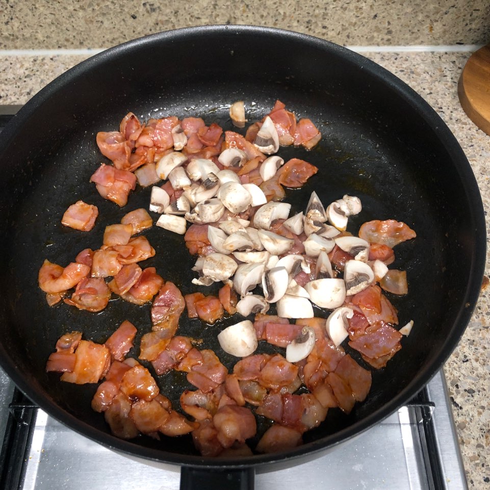 빨갛게 베이컨이나 새우에 물이 들었을 때, 바로 양송이도 투척해줍니다. 양송이도 함께 계속해서 볶아주세요. 전체적으로 빨갛게 변할 때까지 볶아주시면 됩니다. 이후 과정은 생크림과 면수가 들어가기 때문에 그 전에 충분히 볶아주셔야 합니다. 저 같은 경우는 베이컨이 좀 바삭바삭한 걸 좋아하는지라 꽤 오래 볶아버렸습니다.