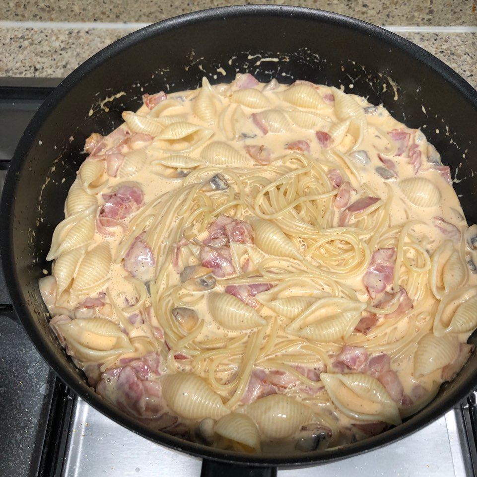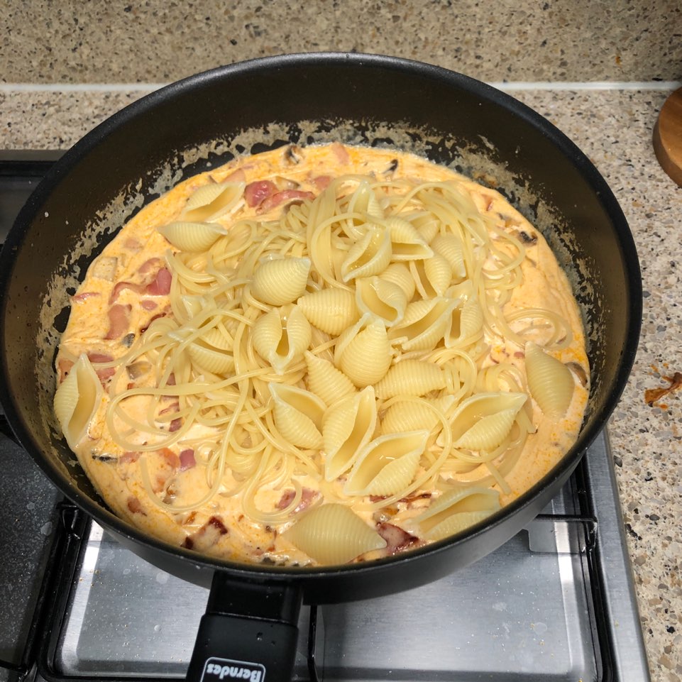 오래 섞으실 필요 없습니다. 1~2분 정도면 완성이 되실 겁니다. 만약 면이 덜 익으셨거나 크림 소스가 많이 굳으셨다면 면수를 살짝 더 넣어주시고 중 불에서 끓여주세요.