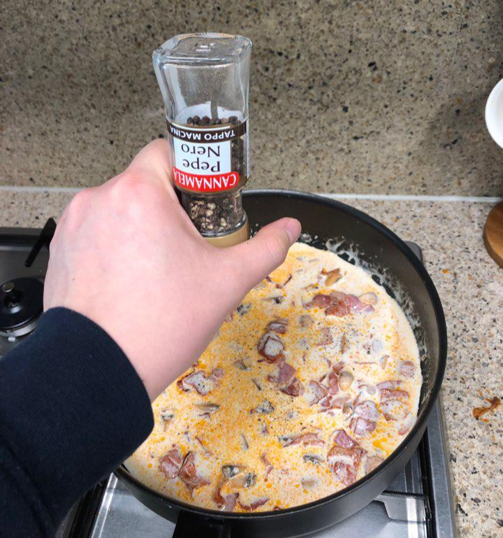 생크림을 부어주셨다면, 그 위에 소금과 후추를 뿌려줍니다. 과하지 않게 적당히 뿌려주시면 됩니다. 제가 용량에 대해 정확히 말씀드리지 않는 이유는 들어가는 재료의 양과 팬의 크기 등이 모두 재각각이기 때문입니다. 이때 되도록 과하지 않게 넣어주고 추 후에 간을 보면서 맞춰가는 방식이 수월하실 겁니다.