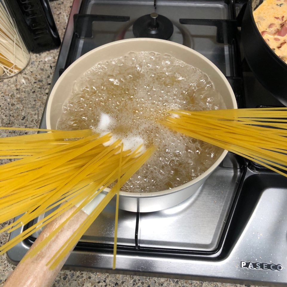 크림 소스가 어느정도 끓고 있다면, 면을 삶아주도록 합니다. 양송이 버섯을 볶기 전에 미리 물을 올려놓으시면 좋습니다. 1000ml 정도 되는 물에 소금을 넣어주시고 물이 팔팔 끓을 때 면을 투척해주시면 됩니다. 이때 저는 기본 스파게티과 라비올리 를 함께 사용했습니다. 사실 면 종류 마다 끓이는 시간이 다른데요, 집에 남아있는 재료로 하다보니, 함께 끓이게 되었습니다. 이 떄 시간은 10분은 넘기셔야합니다. 저 같은 경우 가장 샌 불에서 조금 약하게 끓이는데, 생각보다 오래걸렸습니다. 집마다 화력도 다르고 가스레인지나 웍에 따라 화력이 다르기 때문에 딱 정해진 시간을 말씀드리기가 어렵습니다. 한 가닥 씩 맛보면서 준비하시면 되겠습니다.