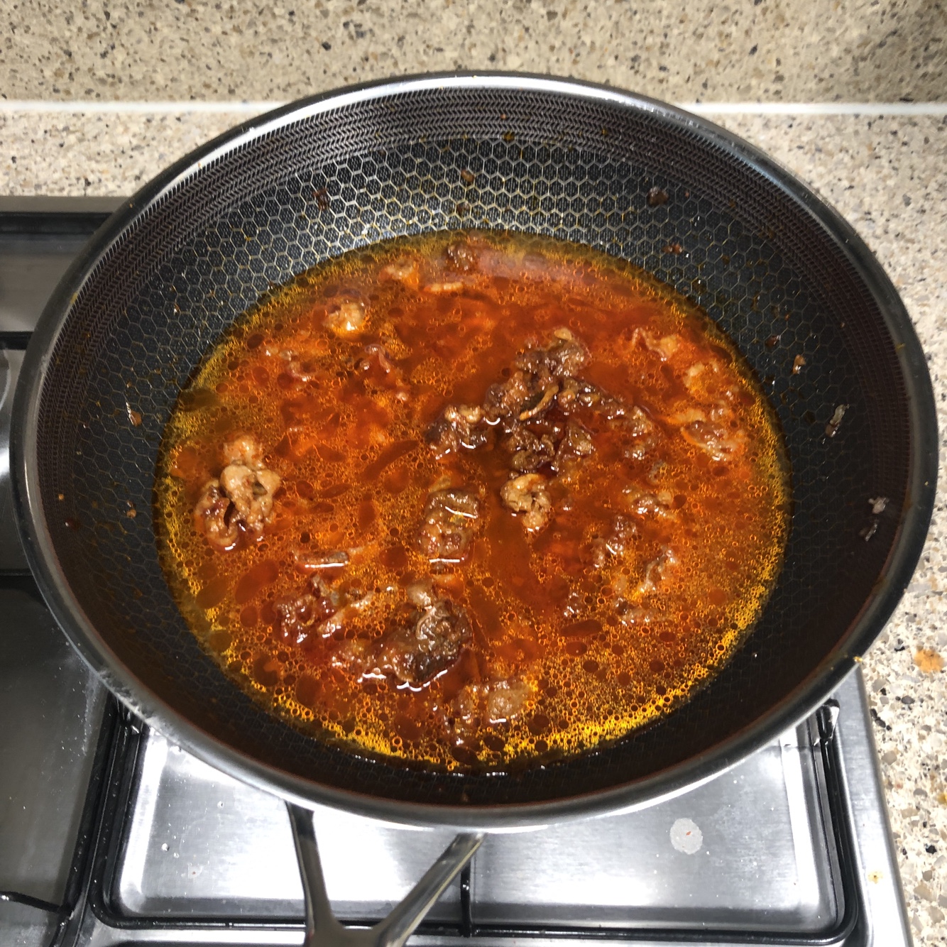 이 상태로 물이 끓을 때까지 기다려주시면 됩니다. 중간중간에 계속 저어주시면서 잘 섞이도록 살펴봐주세요. 그리고 뚜껑도 필수로 덮어주시는 거 잊으시면 안 됩니다. 포인트는 감자를 빨리 익히는 데 있습니다.