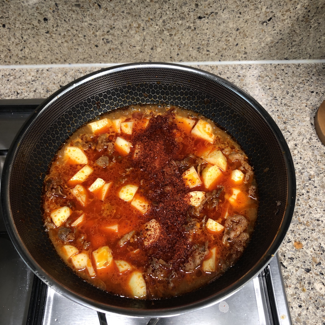 물을 부어주시고 동시에 감자도 넣어주시면 됩니다. 감자가 익혀지는데까지 시간이 꽤 걸리기 때문에 가장 먼저 넣어주셔야 합니다. 또한 고춧가루도 3스푼 정도 뿌려주세요.