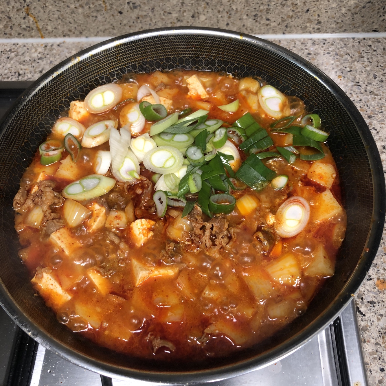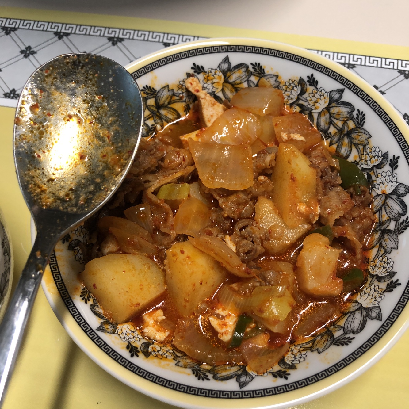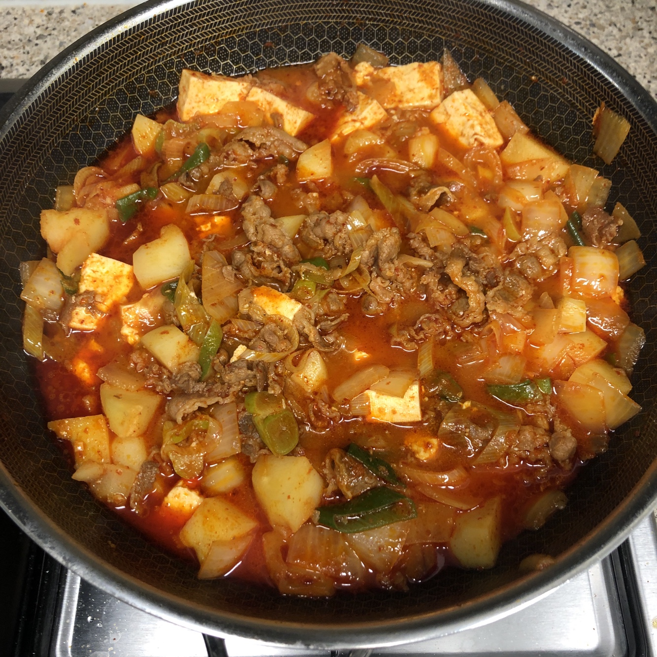 드실 때, 크게 감자와 고기 양파 두부를 한 숟갈로 뜨셔서 한꺼번에 먹는 맛이 일품입니다. 이왕 이야기가 나온김에 다음 시간에는 감자 스팸 짜글이를 한 번 소개해드리도록 하겠습니다. 방식은 비슷한데, 또 맛이 다릅니다.