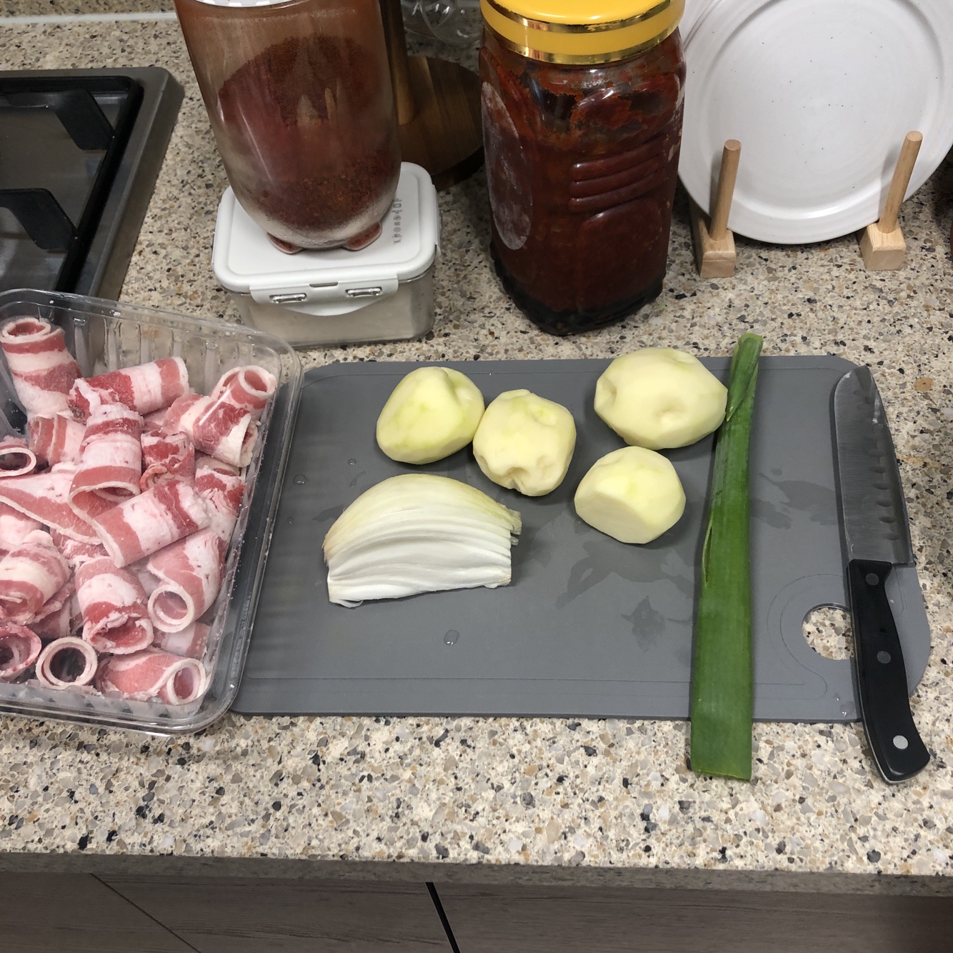 이외에 늘 말씀드리지만, 냉장고에 있는 어울릴법한 재료 무엇이든 상관없습니다. 느타리버섯, 청양 고추가 함께 들어가면 좋습니다. 물론 없으셔도 무방합니다. 위에 보시는 것처럼 감자는 네모 모양으로 사각 썰기를 해줍니다. 양파 역시 큼직큼직하게 사각 썰기가 좋습니다. 얇게 써시는 것보다 큼직하게 썰어서 국물 드실 때 씹는 맛이 있는 것이 더 식감이 좋기 때문입니다.