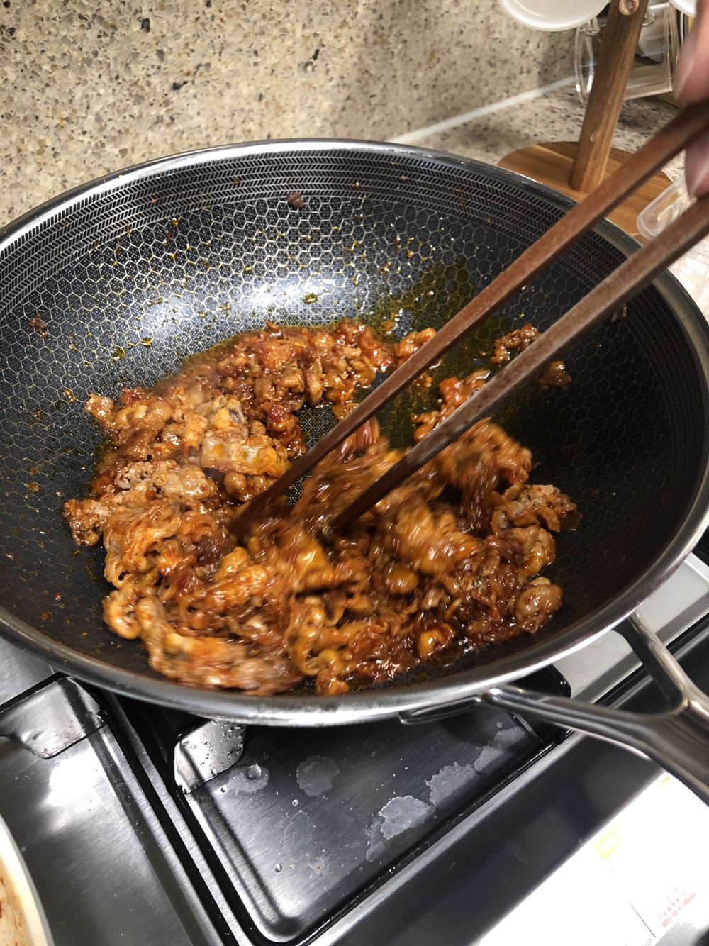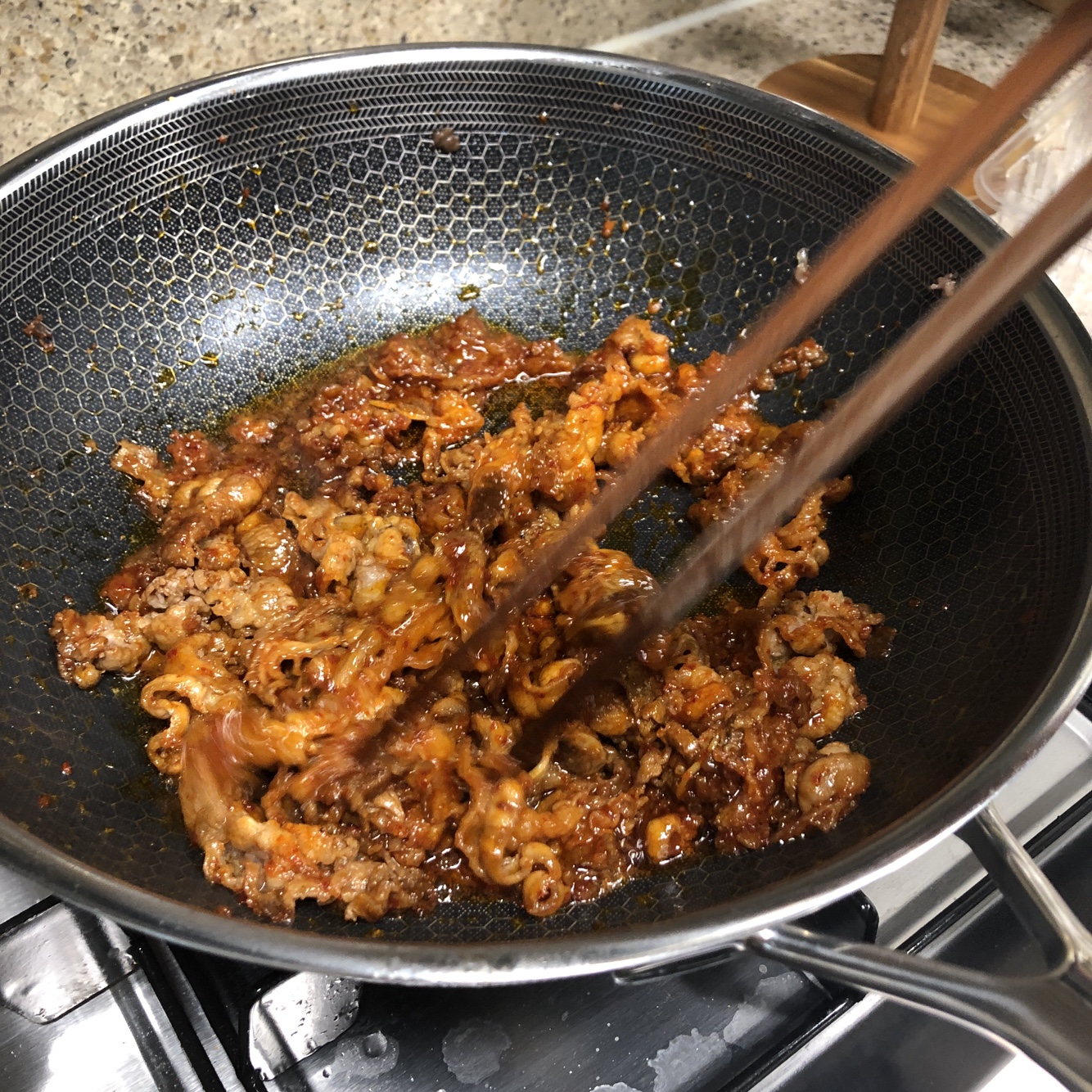 고기가 어느정도 익었다면, 이미지처럼 고기를 한 편으로 몰아준 뒤 고추장을 기름에 볶아줍니다. 이때 포인트는 눌어붙지 않게 계속 휘저어 주는 것입니다. 고추장 특성상 기름이 얼마 없다면 눌어붙을 수가 있기 때문에 주의해주셔야 합니다. 고추장은 고기 양에 따라 맞춰주시면 되는데, 저의 경우 300g 우삼겹에 고추장 5스푼을 넣었습니다. 이때 시중에 파는 고추장을 사용하셔도 좋은데, 저 같은 경우 집에서 담근 고추장이 있어서 집 고추장 2스푼, 시중 고추장 3스푼으로 넣어주었습니다. 집 고추장이 아무래도 살짝 매운맛이 덜하여 그렇습니다.